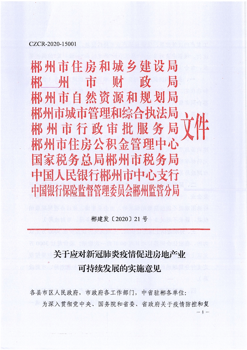 4月30日晚,郴州市住建局、市财政局、市自然资源和规划局、市城管局、市行政审批服务局、市住房公积金中心、国家税务局郴州市税务局、中国人民银行郴州市中心支行、中国银保监会郴州监管分局9部门联合下发了《关于应对新冠肺炎疫情促进房地产业可持续发展的实施意见》(以下简称“意见”),从契税补贴、延期缴纳税款、分期缴纳土地出让价款、分步收取报建费用、阶段性放宽预售申报条件、顺延项目工期和交付期限等10方面稳定楼市。