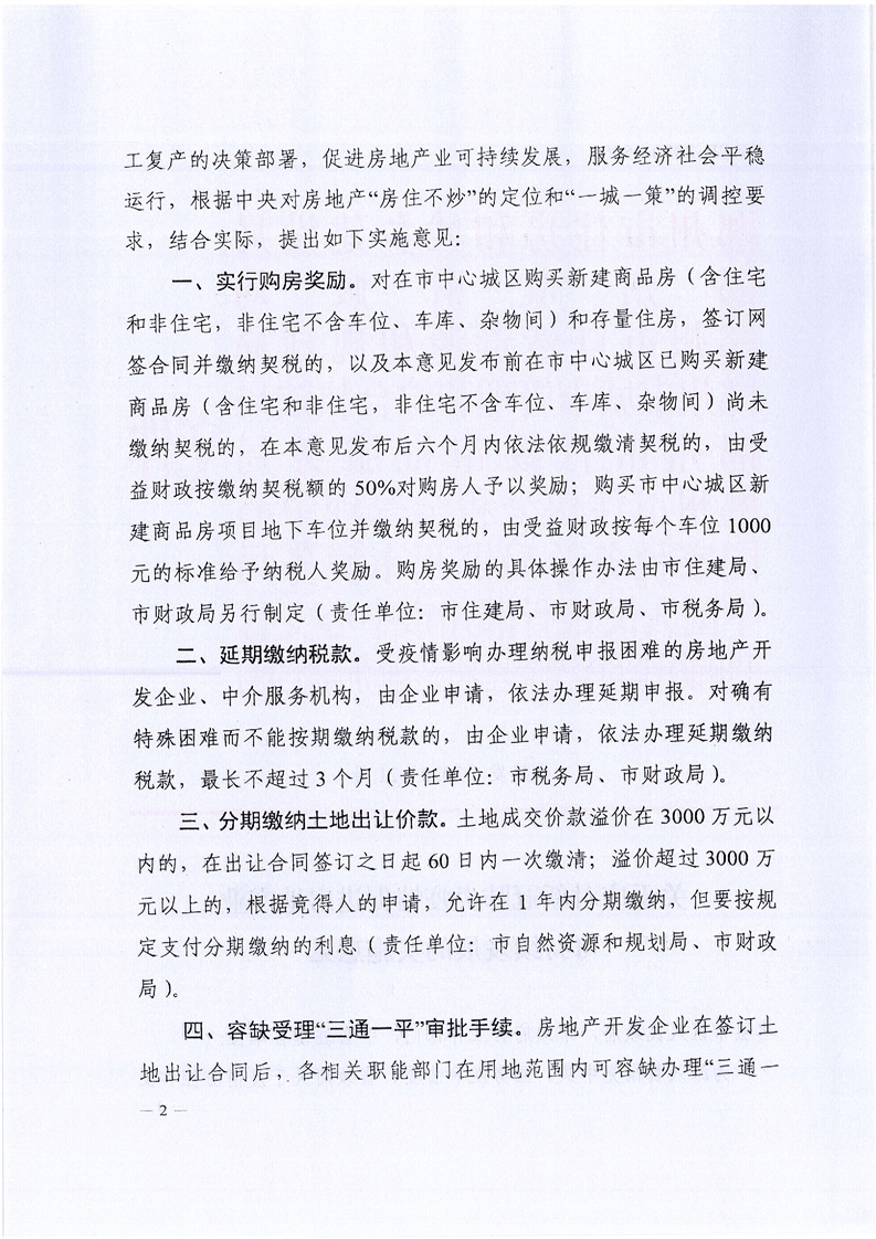 一、实行购房奖励。对在市中心城区购买新建商品房(含住宅和非住宅,非住宅不含车位、车库、杂物间)和存量住房,签订网签合同并缴纳契税的,由受益财政按缴纳契税额的50%对购房人予以奖励;购买市中心城区新建商品房项目地下车位并缴纳契税的,由受益财政按每个车位1000元的标准给予纳税人奖励。