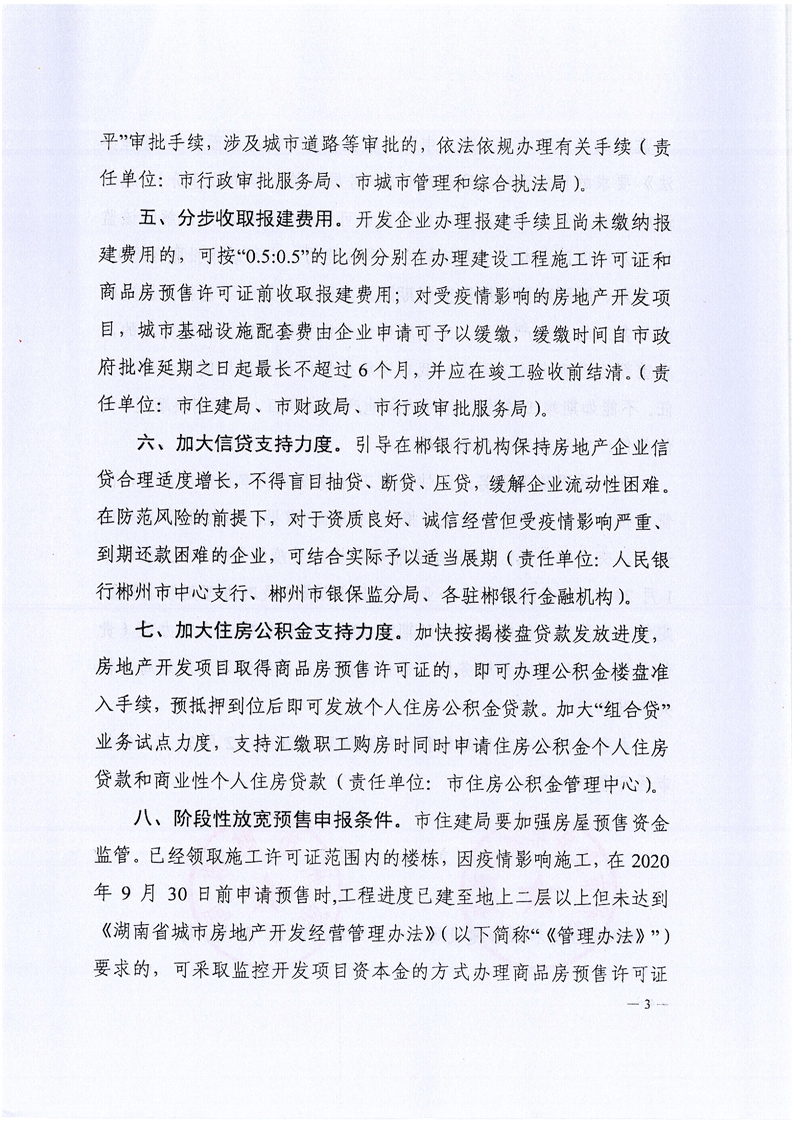 六、加大信贷支持力度。引导在郴银行机构保持房地产企业信贷合理适度增长,不得盲目抽贷、断贷、压贷,缓解企业流动性困难。在防范风险的前提下,对于资质良好、诚信经营但受疫情影响严重、到期还款困难的企业,可结合实际予以适当展期。
