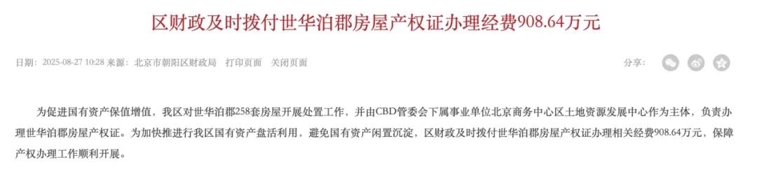 而早在2025年8月,北京市朝阳区财政局便已为世华泊郡258套房屋的产权证办理拨付了908.64万元专项经费,明确此举旨在“加快推进我区国有资产盘活利用,避免国有资产闲置沉淀”。