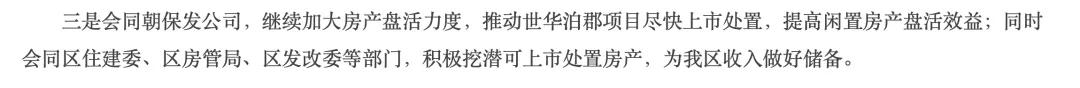 2026年2月,北京市朝阳区财政局发布的工作部署文件显示,“会同朝保发公司,继续加大房产盘活力度,推动世华泊郡项目尽快上市处置,提高闲置房产盘活效益”。同时提及,“积极挖潜可上市处置房产,为我区收入做好储备”。