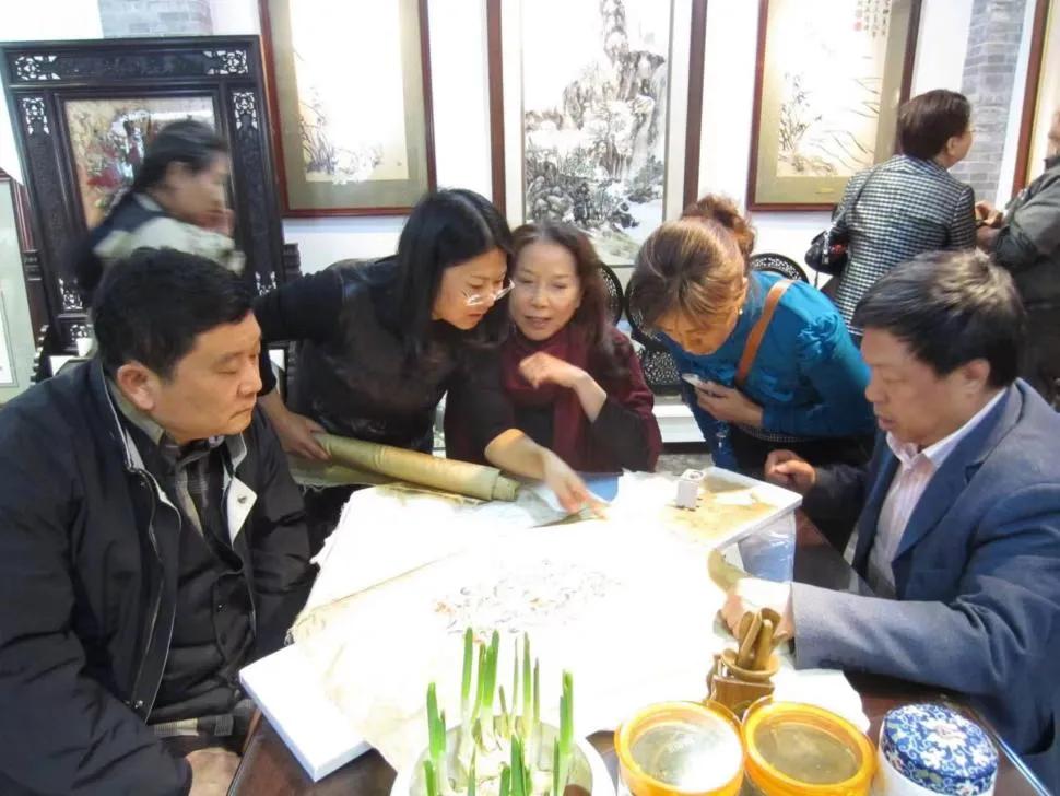 王时伟(左一)在与苏州织绣手工艺人交流双面绣复制工作。